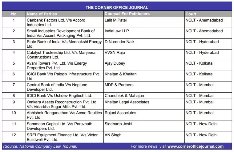NCLT to hear cases related to Accord Industries, Meenakshi Energy, Neptune Developer, Ushdev Engitech and Parsvnath Developers