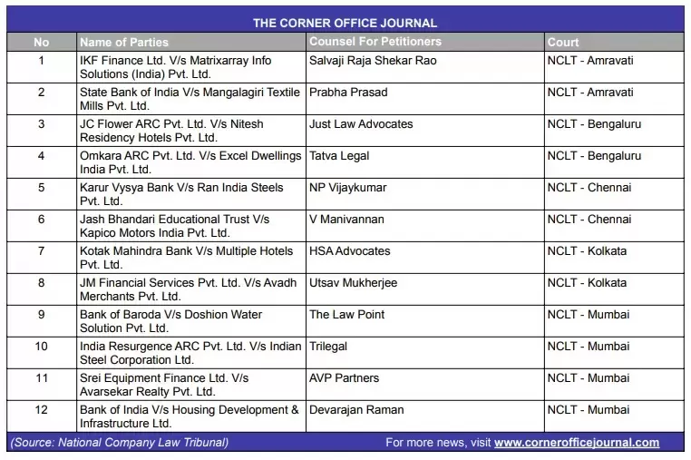 NCLT to hear cases related to Avarsekar Realty, Nitesh Residency Hotels, Kapico Motors and Housing Development & Infrastructure