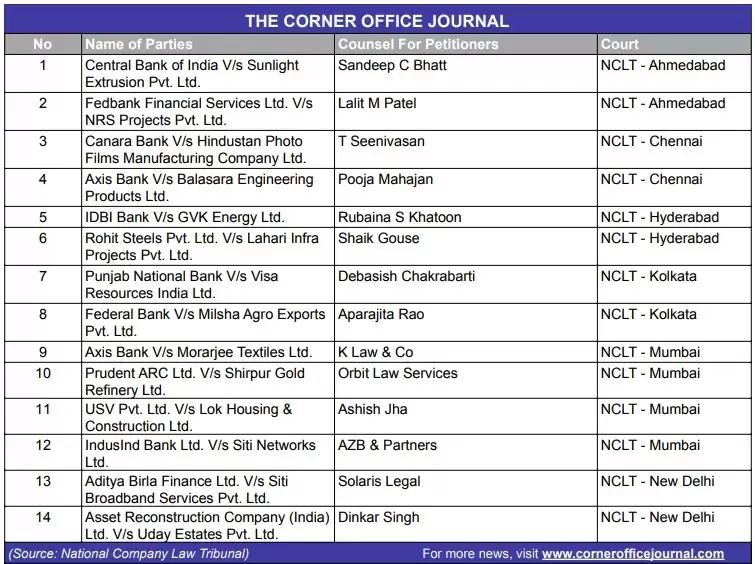 NCLT to hear cases related to Morarjee Textiles, Shirpur Gold Refinery, GVK Energy, Siti Networks and Lok Housing & Construction