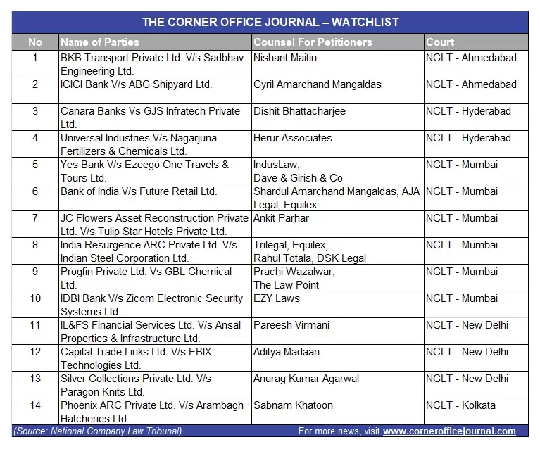 NCLT to hear cases related to Sadbhav Engineering, Ezeego One Travels, ABG Shipyard, Nagarjuna Fertilizers, Future Retail and Tulip Star Hotels