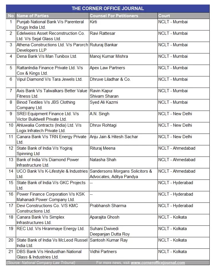 NCLT to hear cases related to Sejal Glass, Tara Jewels, Talwalkars Better Value Fitness, Cox & Kings and Diamond Power Infrastructure