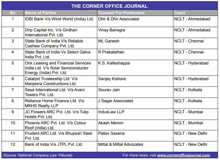 NCLT to hear cases related to Tulip Hotels, Colour Roof (India), Bhupesh Steel, Wind World (India), Manjeera Constructions