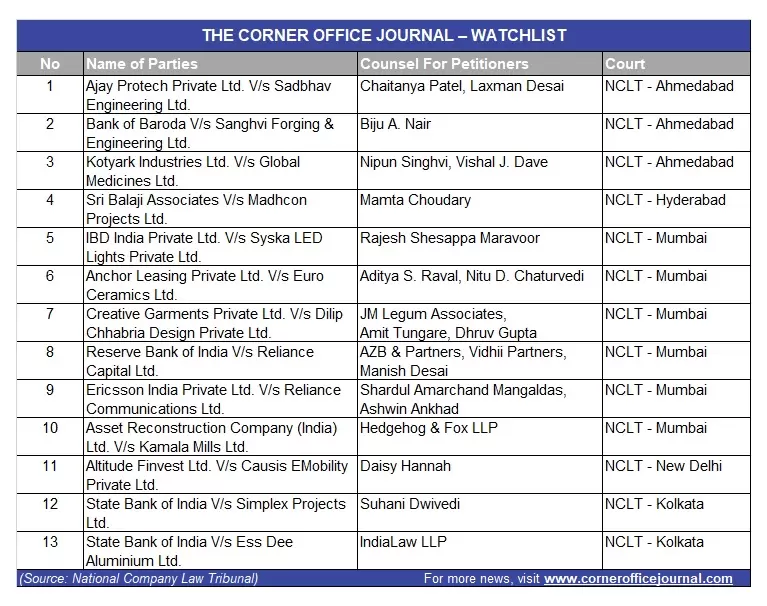 NCLT to hear cases related to Reliance Capital, Kamala Mills, Ess Dee Aluminium, Reliance Communications, Sadbhav Engineering and Syska LED Lights