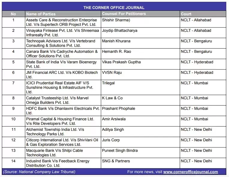 NCLT to hear cases related to Rite Developers, Technology Parks, Varam Bioenergy, Dhanlaxmi Electricals and Feedback Energy Distribution