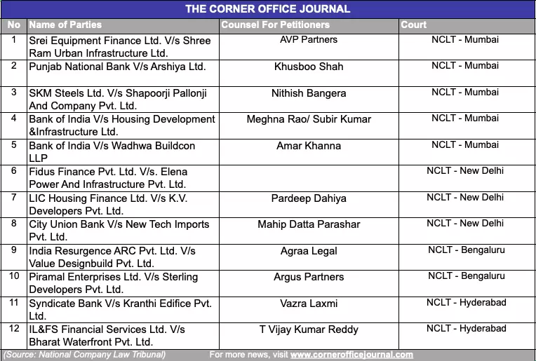 NCLT to hear cases related to Arshiya, Shapoorji Pallonji, Wadhwa Buildcon, Sterling Developers and Shree Ram Urban Infrastructure