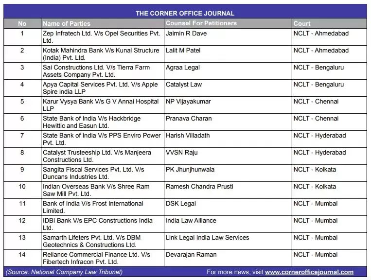 NCLT to hear cases related to EPC Constructions India, Apple Spire India, Duncans Industries, DBM Geotechnics and Shree Ram Saw Mill