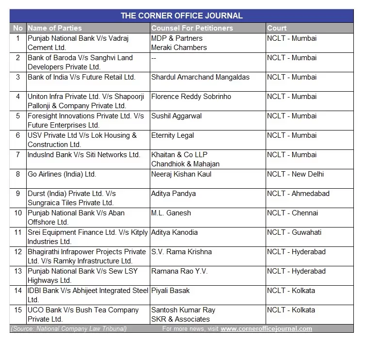 NCLT to hear cases related to Go Airlines, Siti Networks, Future Retail, Shapoorji Pallonji, Aban Offshore, Future Enterprises and Kitply Industries