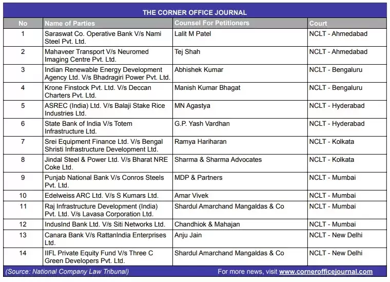 NCLT to hear cases related to Lavasa Corporation, Rattanlndia Enterprises, Siti Networks, Bhadragiri Power and Bharat NRE Coke