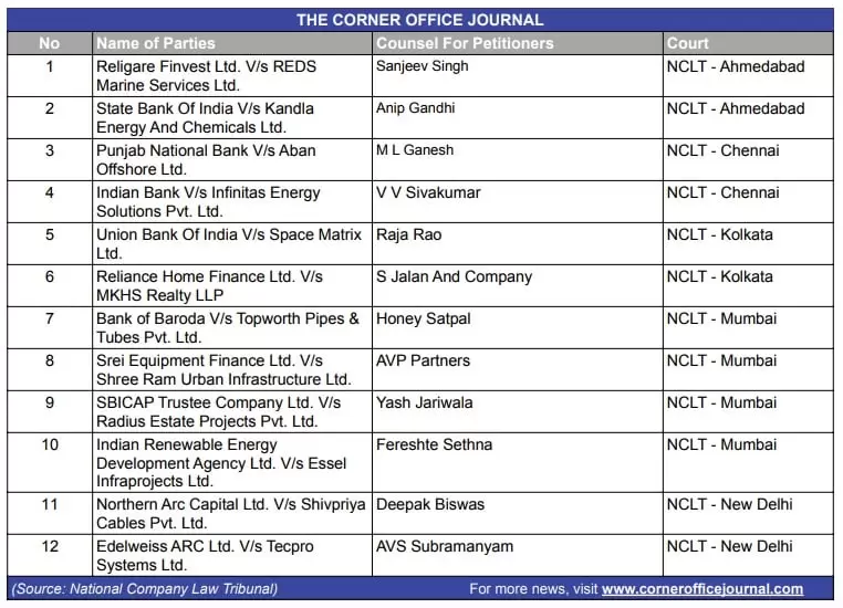 NCLT to hear cases related to Topworth Pipes & Tubes, Shree Ram Urban Infrastructure, Shivpriya Cables and Aban Offshore