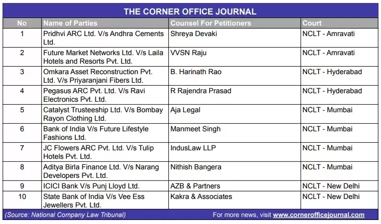 NCLT to hear cases related to Tulip Hotels, Punj Lloyd, Andhra Cements, Future Lifestyle Fashions, Bombay Rayon Clothing and Priyaranjani Fibers