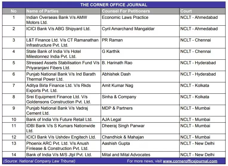 NCLT to hear cases related to Vadraj Cement, Future Retail, AMW Motors, ABG Shipyard and Ind-Barath Thermal Power