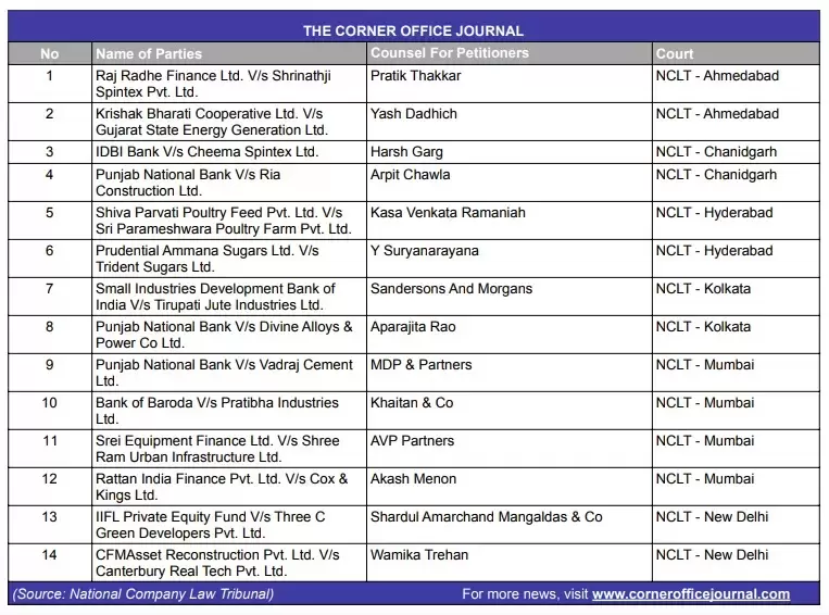 NCLT to hear cases related to Vadraj Cement, Pratibha Industries, Cox & Kings, Shree Ram Urban Infrastructure and Gujarat State Energy Generation