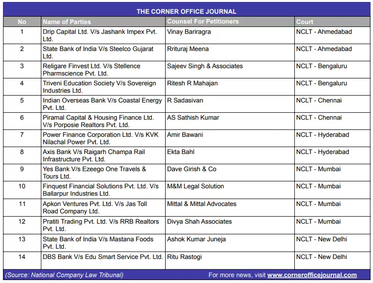 NCLT to hear cases related to Edu Smart Service, Steelco Gujarat, Ezeego One Travels & Tours, Sovereign Industries and Ballarpur Industries
