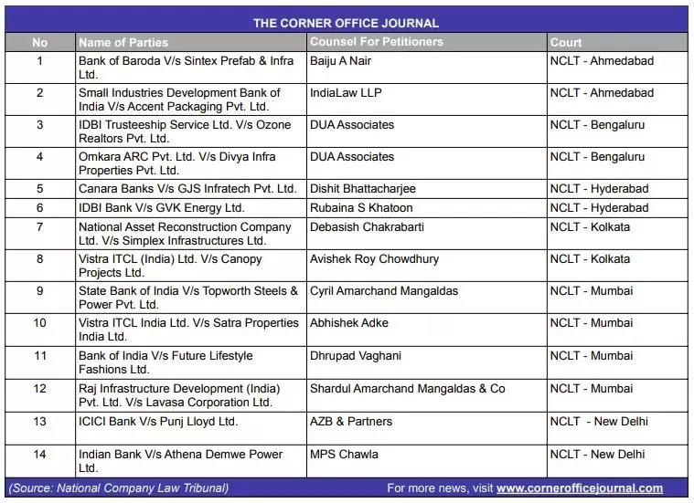 NCLT to hear cases related to Lavasa Corporation, Punj Lloyd, GVK Energy, Future Lifestyle, Topworth Steels & Power and Simplex Infrastructures