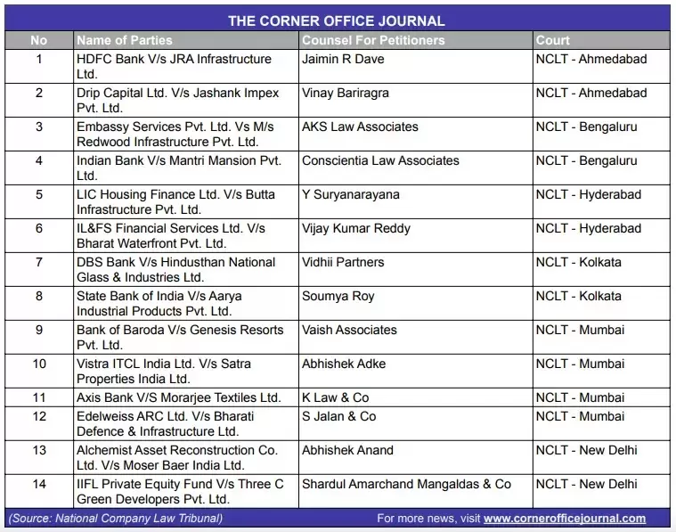 NCLT to hear cases related to Morarjee Textiles, Genesis Resorts, Bharati Defence & Infrastructure, JRA Infrastructure and Aarya Industrial Products