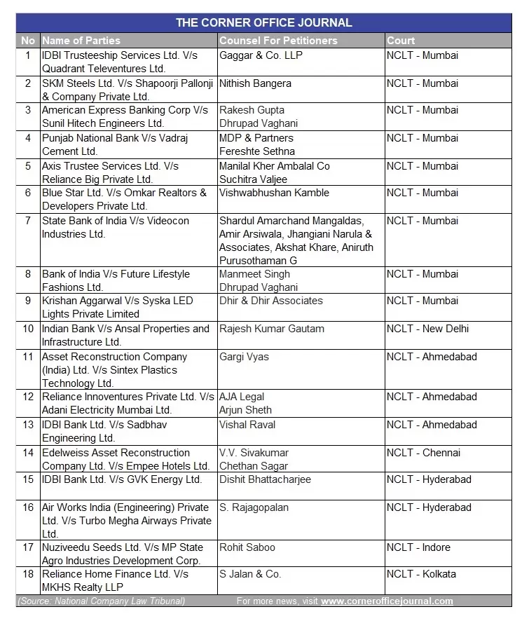 NCLT to hear cases related to Shapoorji Pallonji & Co, Reliance Big, Videocon Industries, Future Lifestyle, Sadbhav Engineering and GVK Energy