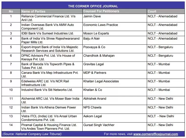 NCLT to hear cases related to Siti Networks, Sumeet Industries, Topworth Pipes, Athena Demwe Power, House of Kieraya and NCR Rail Infrastructure
