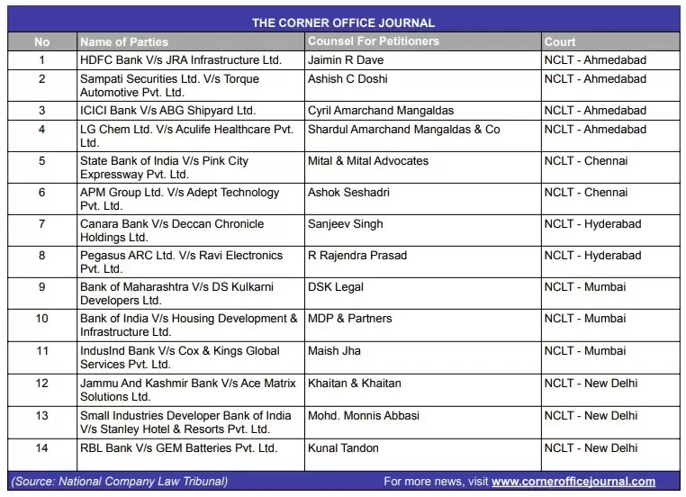 NCLT to hear cases related to ABG Shipyard, Ravi Electronics, Torque Automotive, Cox & Kings Global Services and Deccan Chronicle Holdings