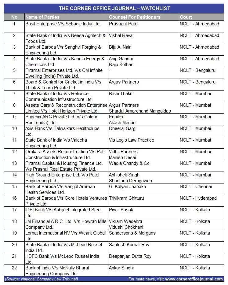 NCLT to hear cases related to Think & Learn, McLeod Russel India, Kandla Energy & Chemicals, Colour Roof (India) and Valecha Engineering