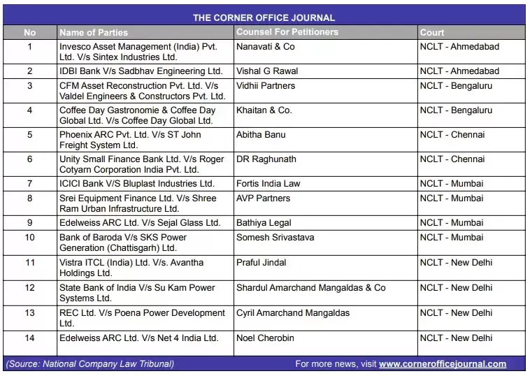 NCLT to hear cases related to Avantha Holdings, Coffee Day Global, Sadbhav Engineering, Bluplast Industries, Sejal Glass and Sintex Industries