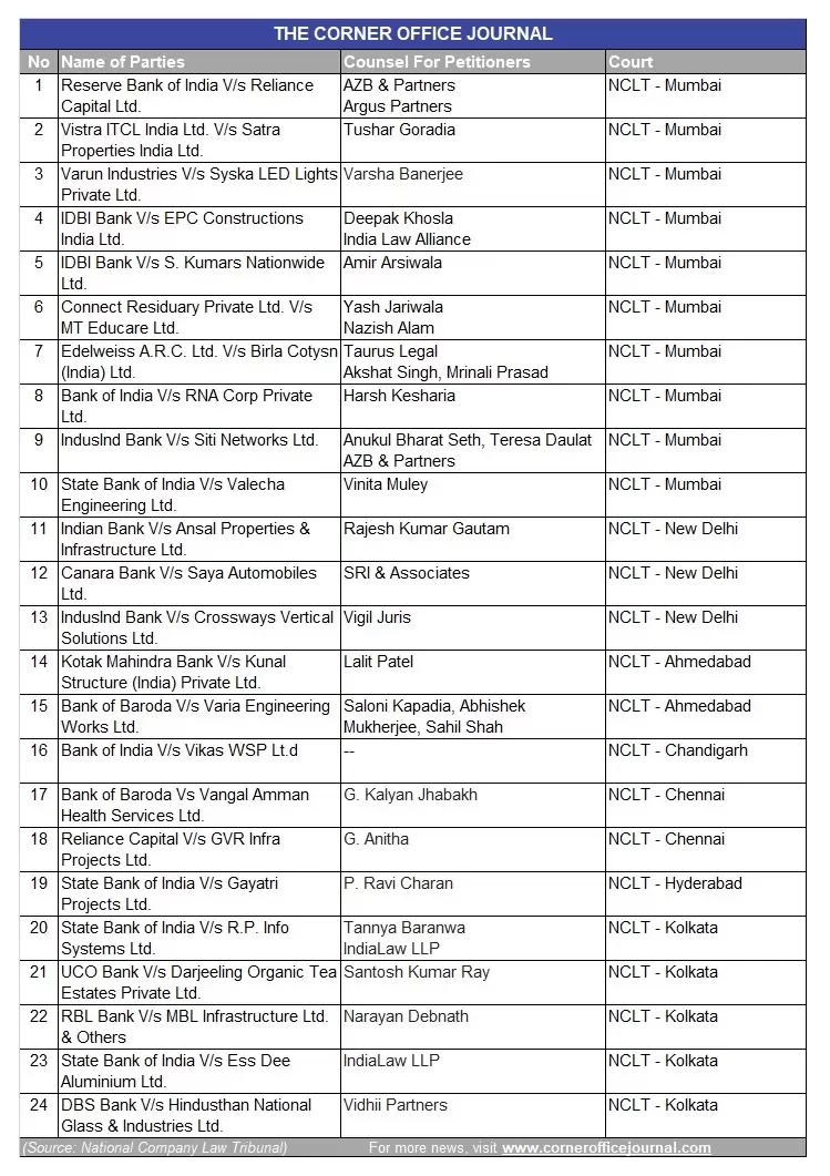 NCLT to hear cases related to Siti Networks, Reliance Capital, MT Educare, Ansal Properties, Birla Cotysn, Ess Dee Aluminium and Gayatri Projects