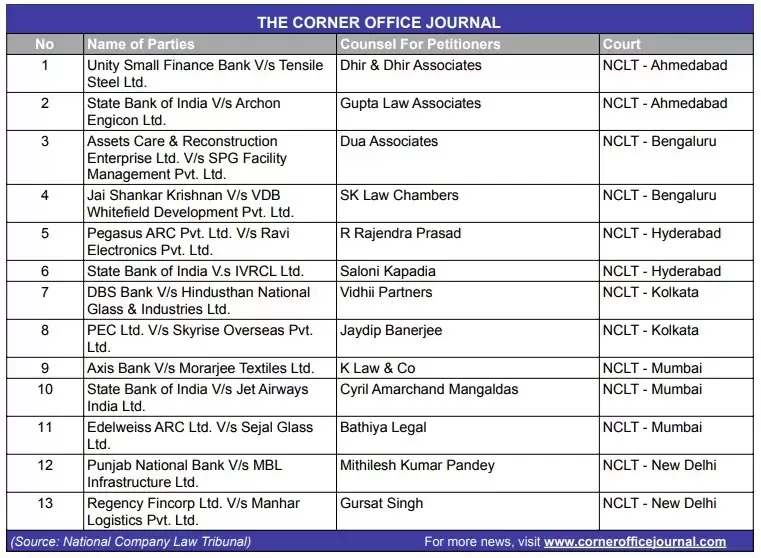 NCLT to hear cases related to Morarjee Textiles, Sejal Glass, Hindusthan National Glass & Industries, Jet Airways and IVRCL