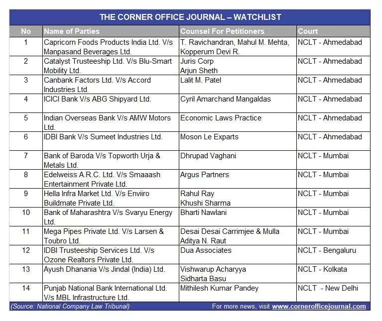 NCLT to hear cases related to Blu-Smart Mobility, Larsen & Toubro, Jindal (India), ABG Shipyard, Manpasand Beverages and Sumeet Industries