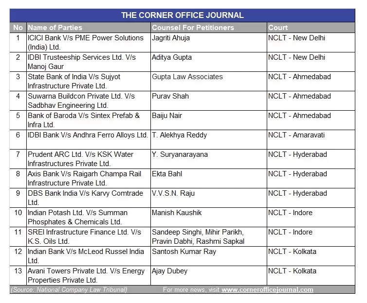 NCLT to hear cases related to Sadbhav Engineering, McLeod Russel, Sintex Prefab & Infra, Karvy Comtrade, Andhra Ferro Alloys and K.S. Oils