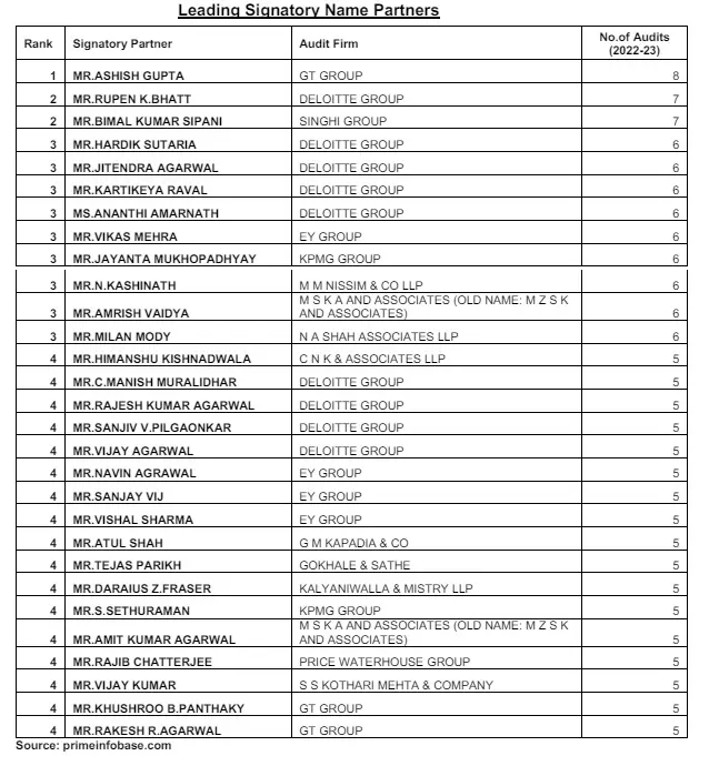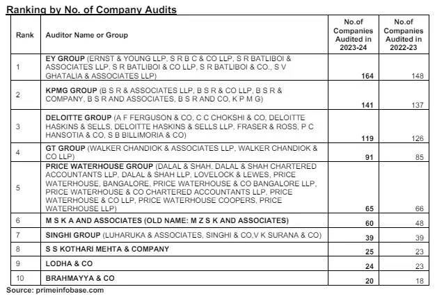 (The Corner Office Journal) -- The Big Six Indian audit firms Deloitte, EY, Grant Thornton, KPMG, MSKA and PwC between them handled a high 323 assignments of the 483 Nifty-500 companies as on 31 March 2024, according to primeinfobase.com, an initiative of PRIME Database Group.